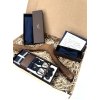 Krásná dárková sada s luxusním masivním ramínkem od značky Mekko, tmavomodrými kšandami od značky Bubibubi, doplněné o kravatu a motýlka Navy od stejné značky. To všechno zabalené s láskou v krásném dárkovém balení a navíc ručně psaný vzkaz.