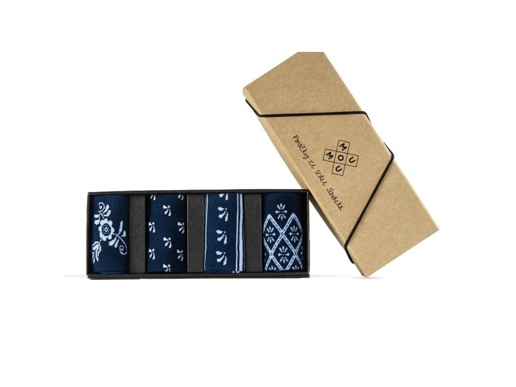 Set 4 párů folklórních ponožek inspirovaných modrotiskem (Čagan, velehrad, Chalúpka, Velička) vyrobené v Srdci Slovácka.