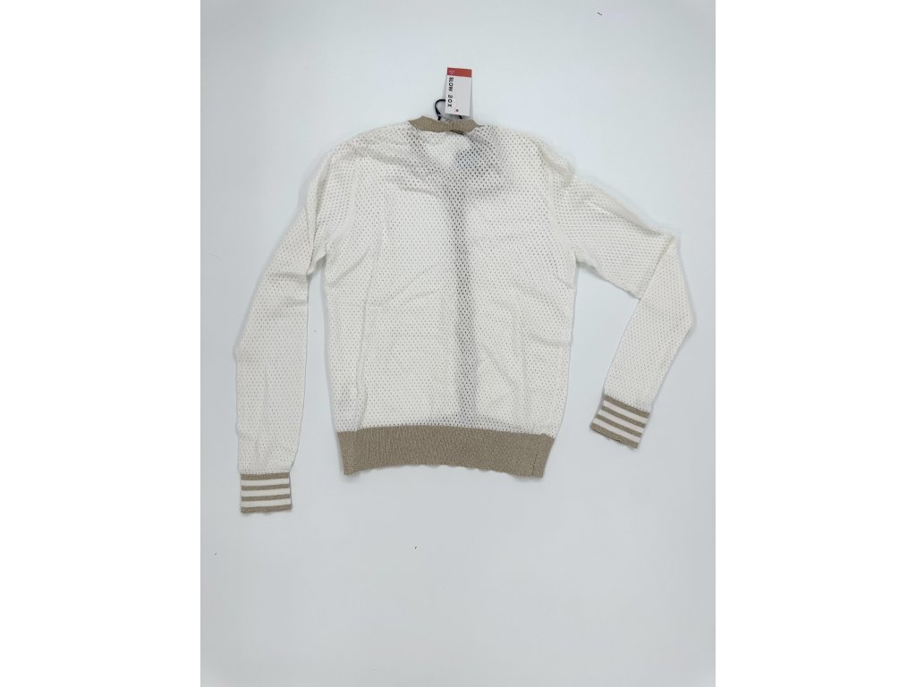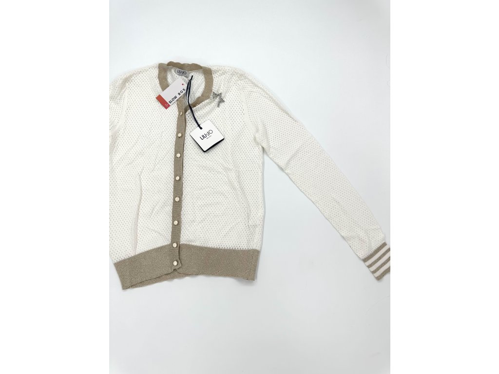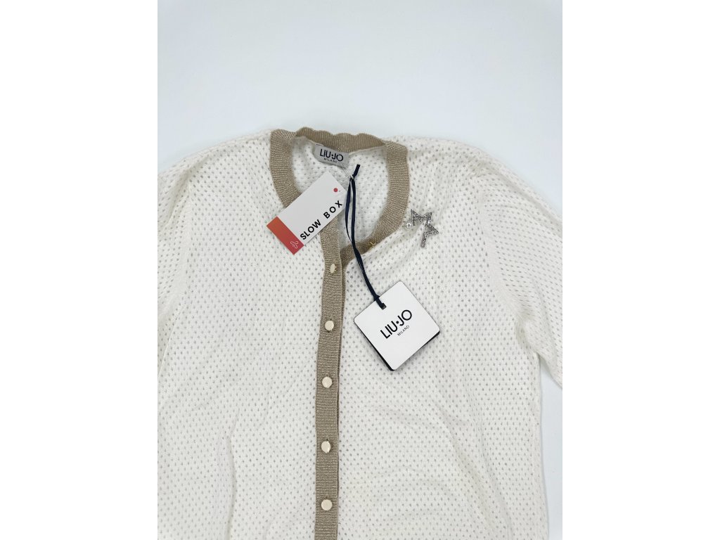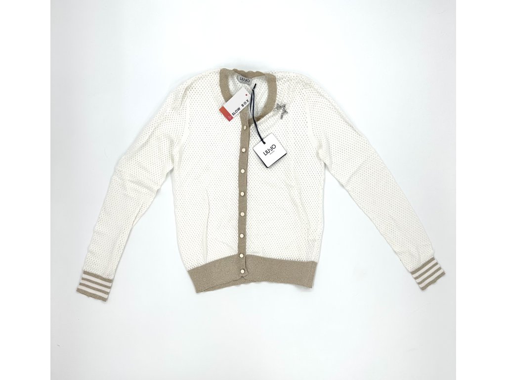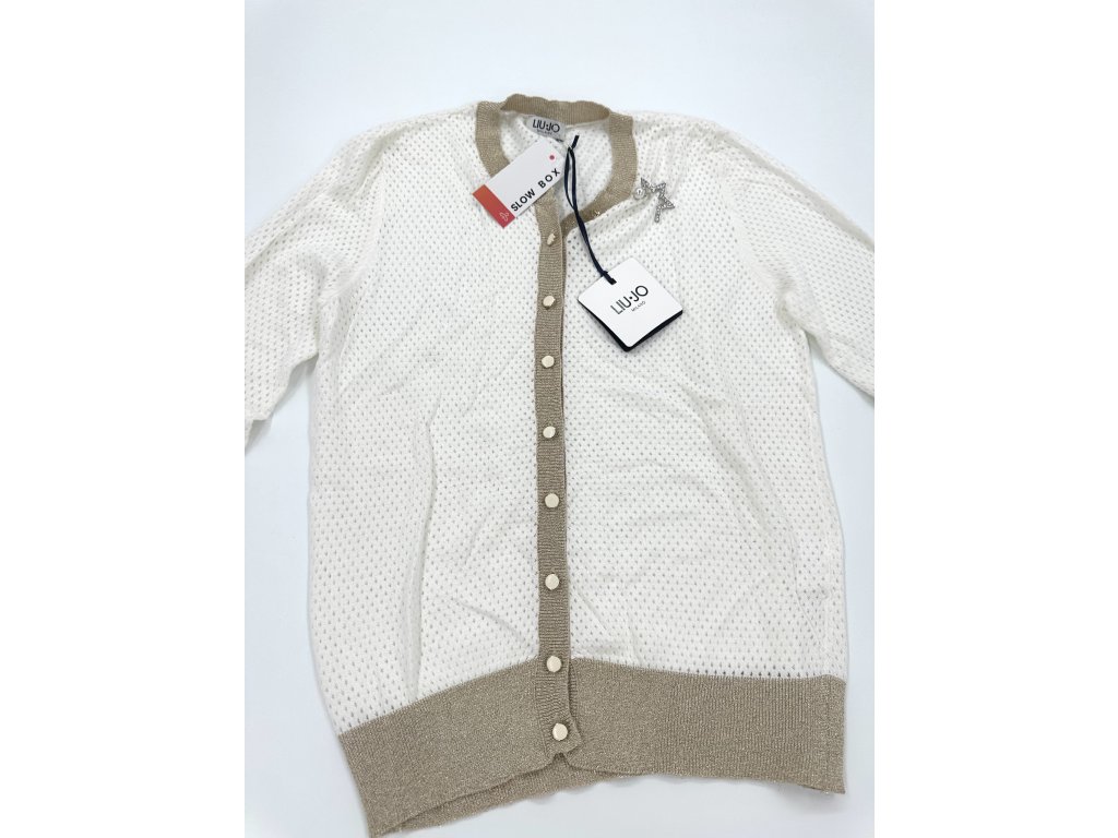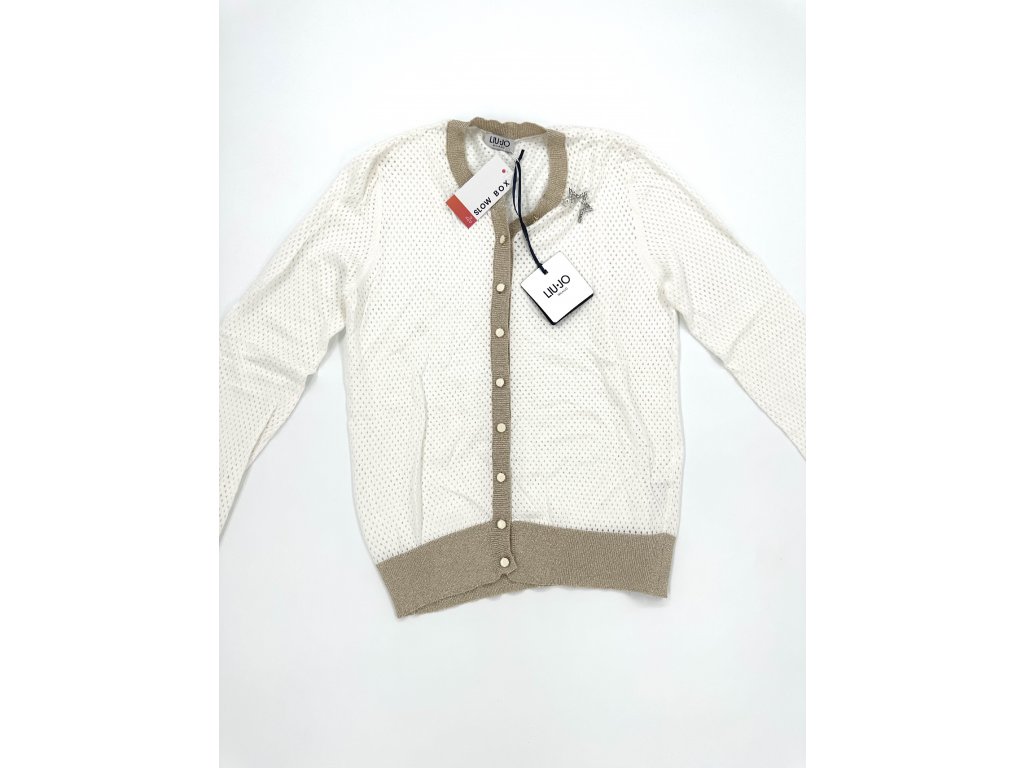 Lehký dírkovaný svetrík v krémové barvě s ozdobnou broží od zančky Liu Jo