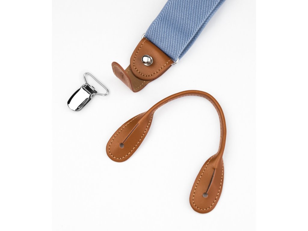 Modré kšandy s hnědými poutky od české značky Bubibubi