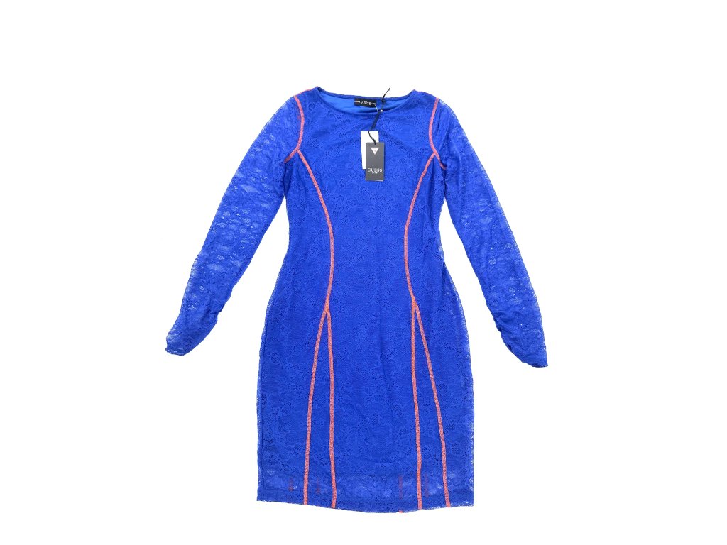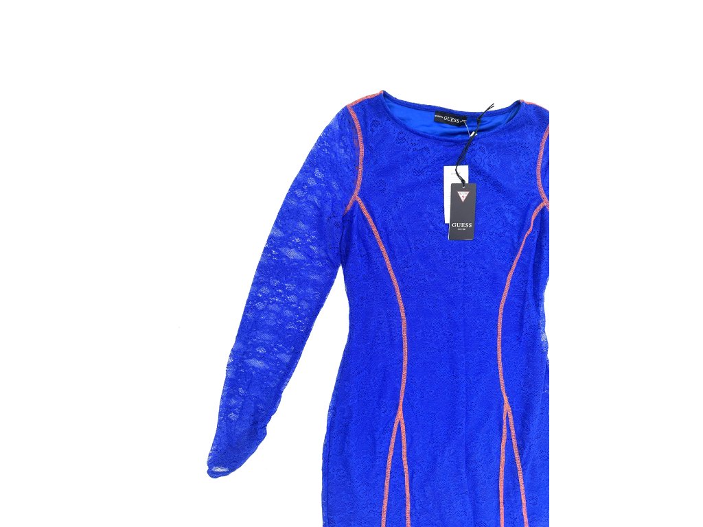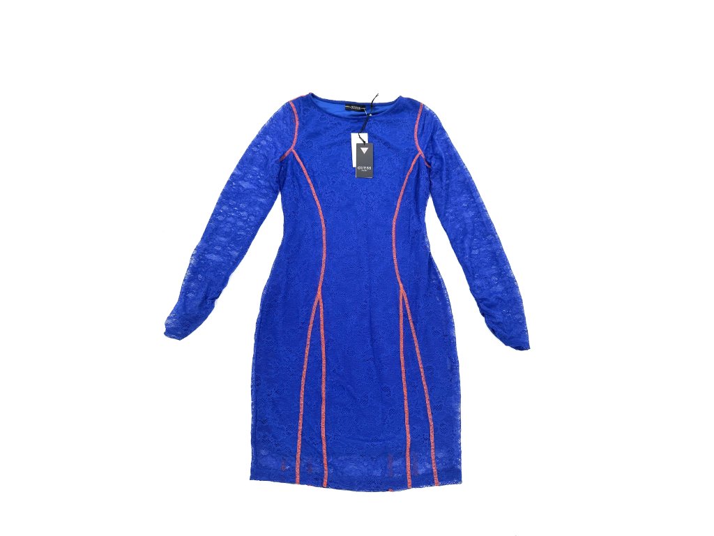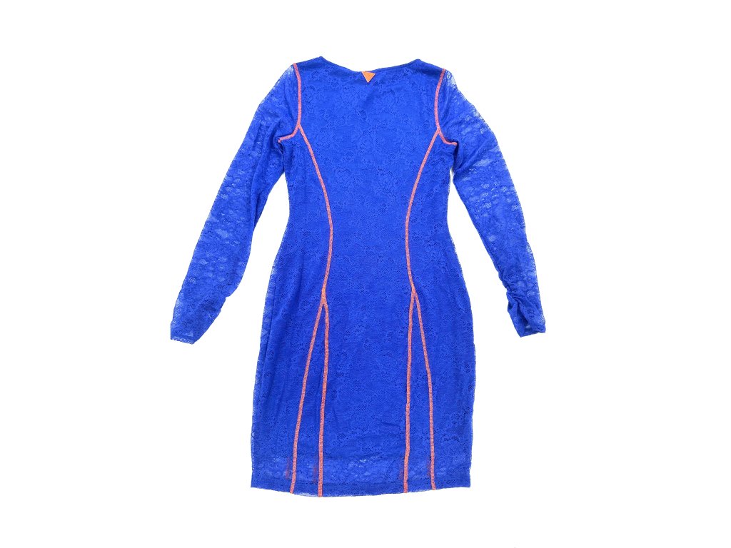 Modré krajkové šaty se zaajímavým oranžvým detailem od značky Guess