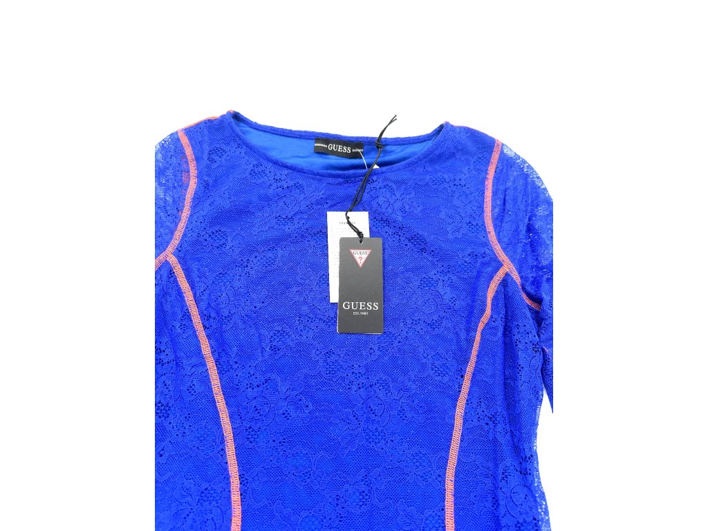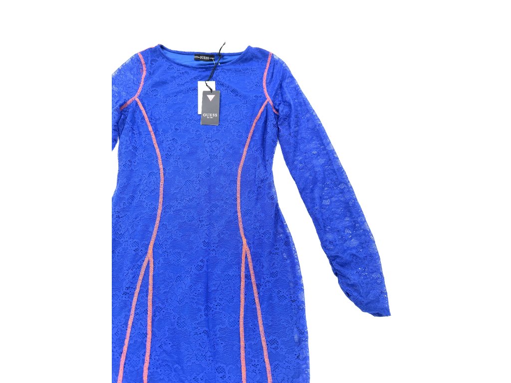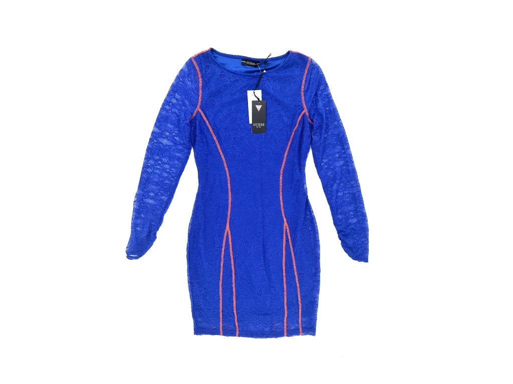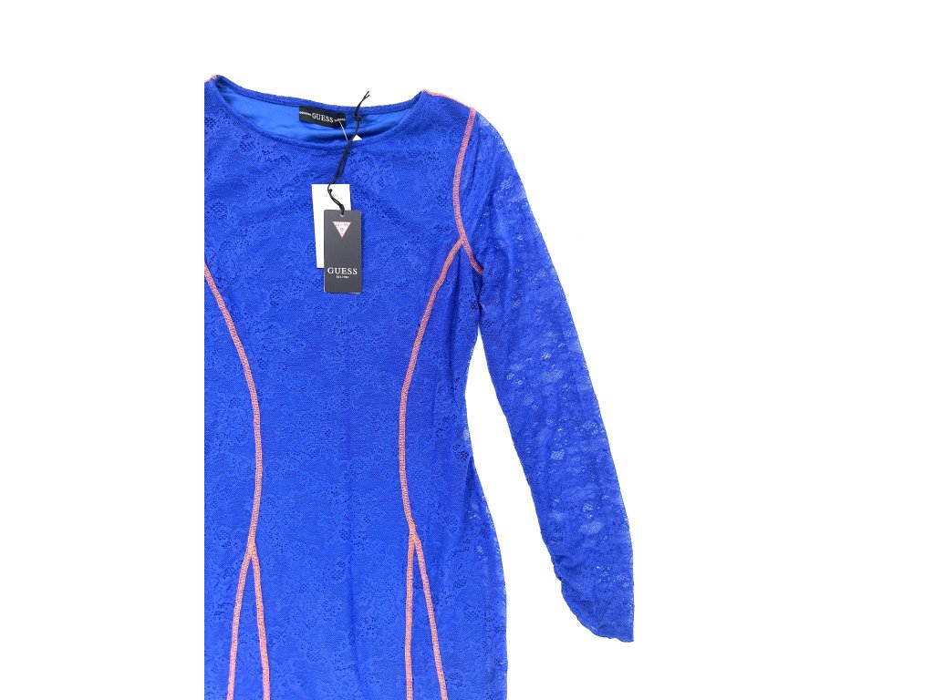 Modré krajkové šaty se zaajímavým oranžvým detailem od značky Guess