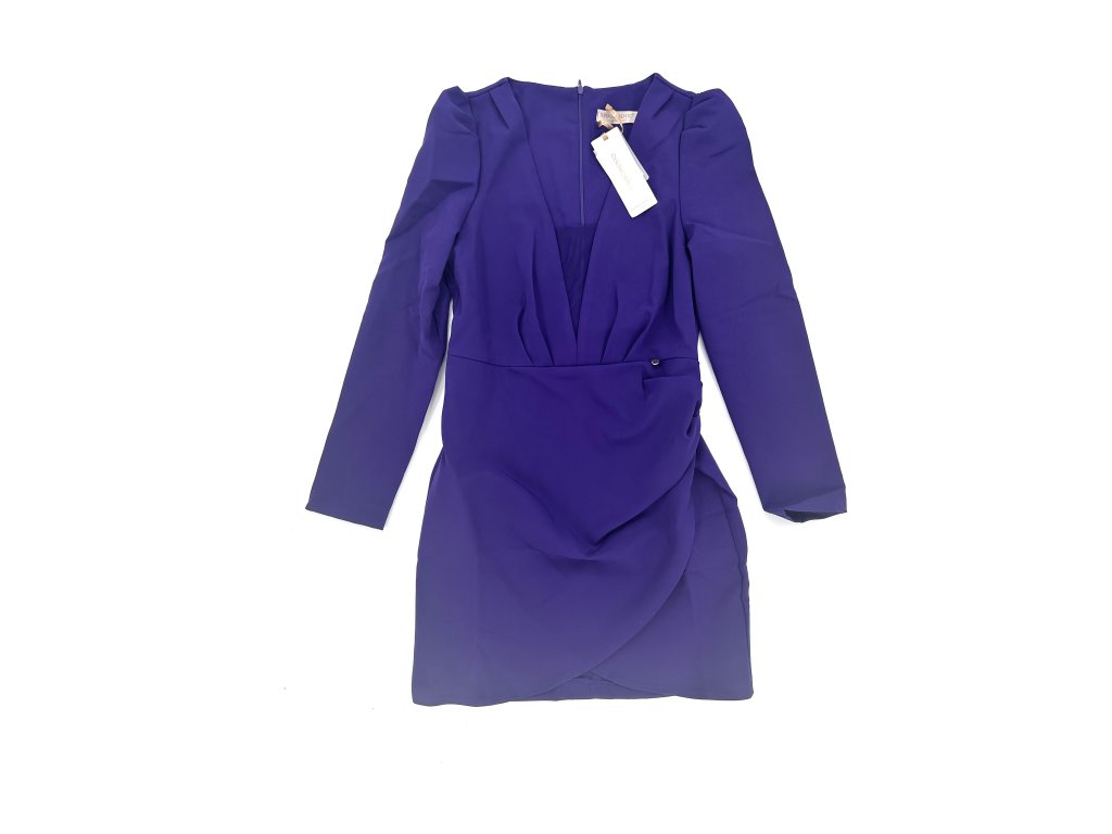 Krásné fialové šaty s nabíranými rameny a rafinovaným výstřihem, který má ve své spodní části průhlednou síťku