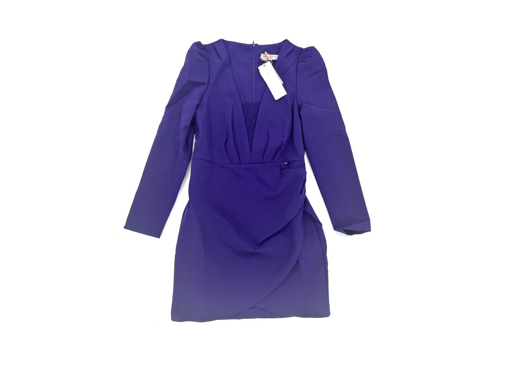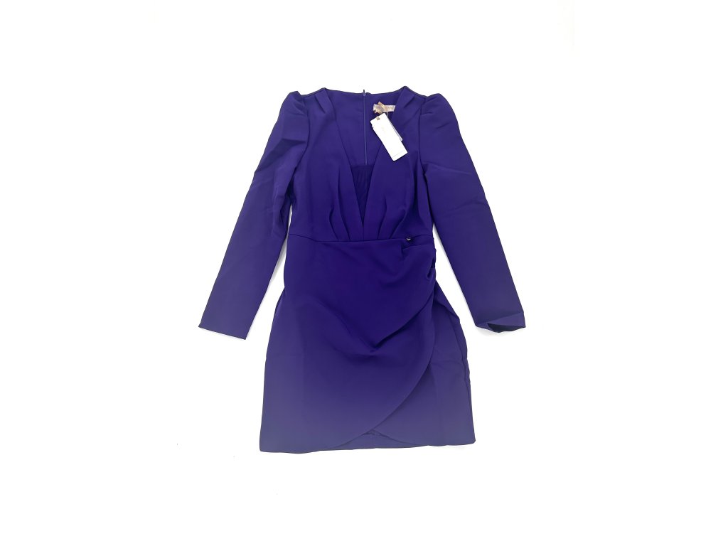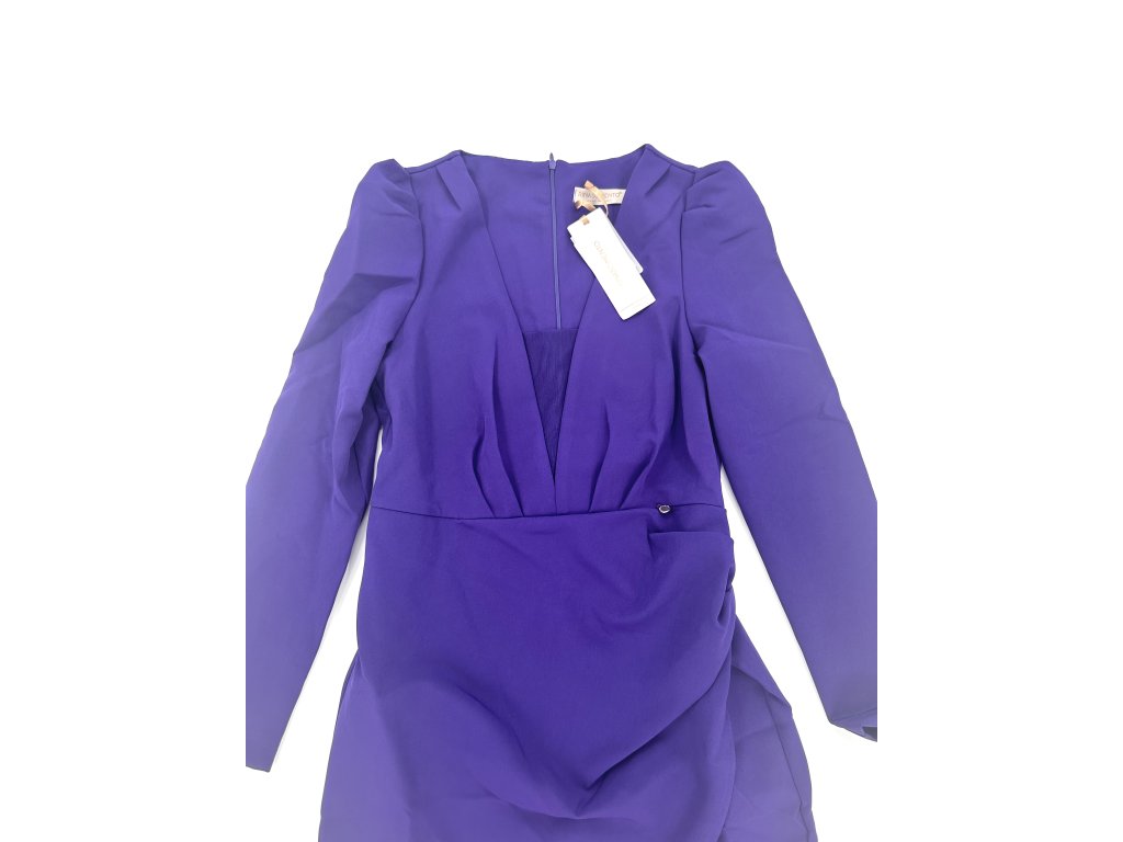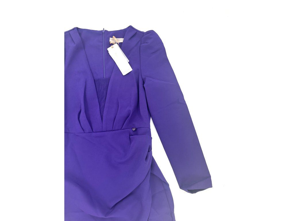 Krásné fialové šaty s nabíranými rameny a rafinovaným výstřihem, který má ve své spodní části průhlednou síťku