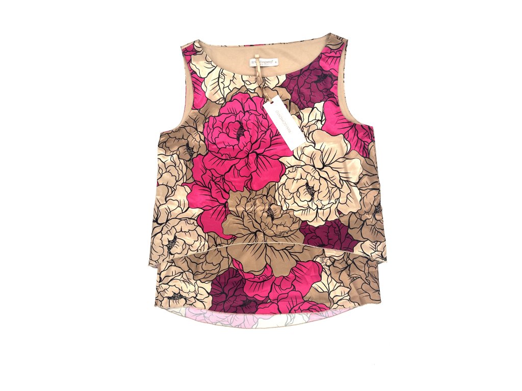 Květinový top bez rukávů s límečkem od značky Rinnascimento zabudovaná guma na stranách v pase pro podtržení postavy